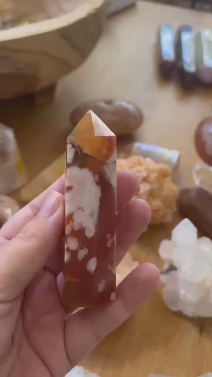Carnelian + Flower Agate is a magical mix of deep connection & healing with femininity, joy & spontaneity. Perfect for those seeking to discover their divine feminine self, she is supportive and encouraging.